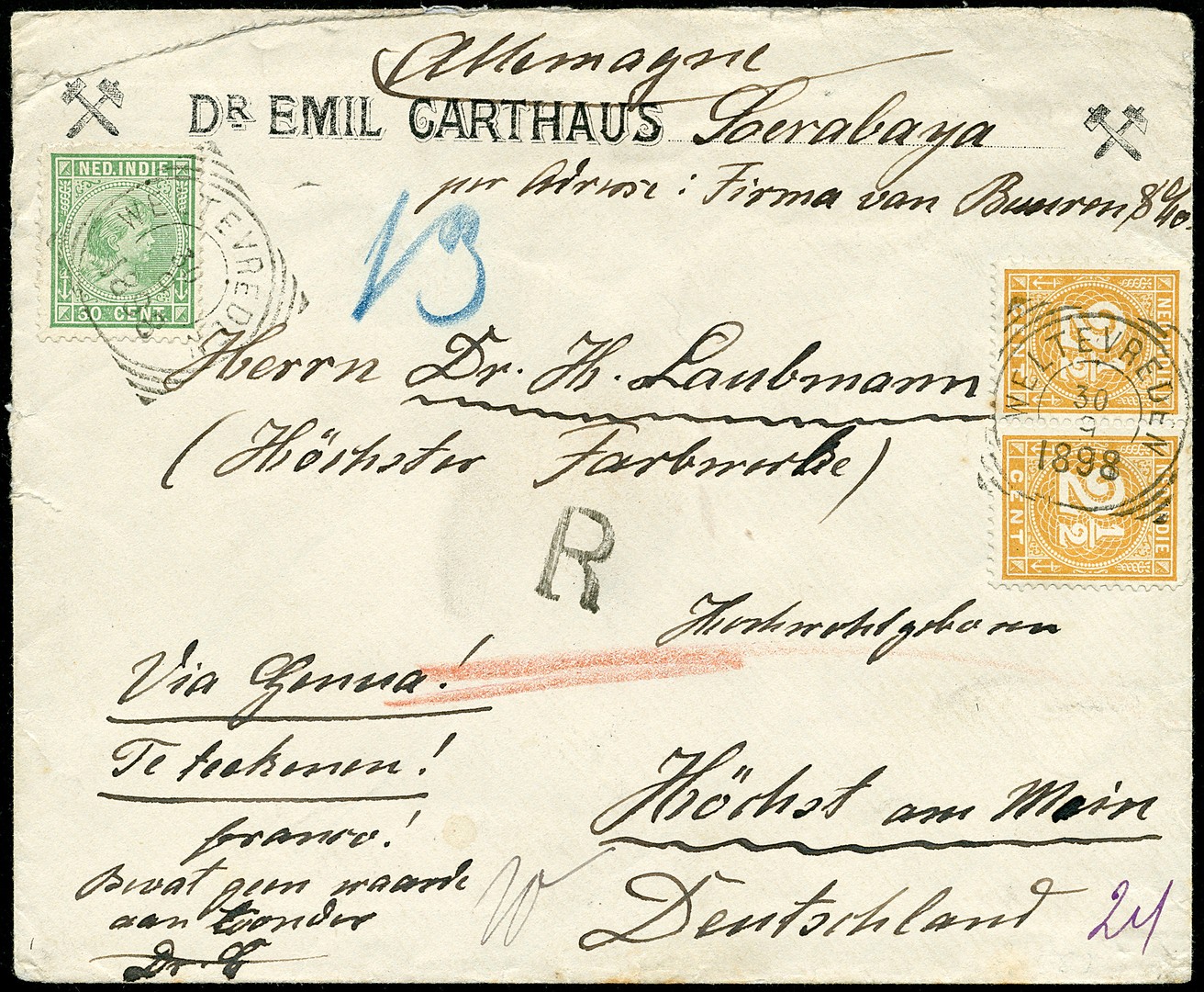 DUITSLAND. 30 Cent nr. 28 met 2½c nr. 18 in paar (1 ex. rond hoekje) op wat ruw geopend couvert van mijnbouwingenieur aangetekend van Weltevreden 30-9-1898 naar Höchst (Main) 1-11. Schaars