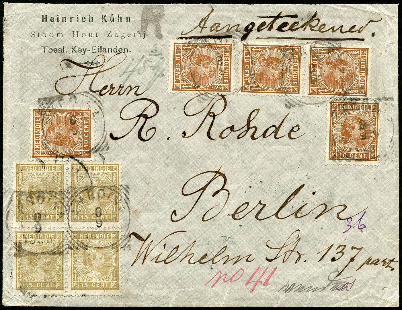 DUITSLAND. 10 Cent nr. 23 (5x) en 15c nr. 25 in blok van vier op env. van Kühn, stoomhoutzagerij te Toeal (Molukken), van 45 gram aangetekend te Amboina 8-9-1899 over Soerabaja 17-9 en Weltevreden naar Berlijn 17-10. Port 4e gew. klasse (45-60 gr) + R-recht 10c = 110 cent. Info Kühn uit Toeal bijgesloten
