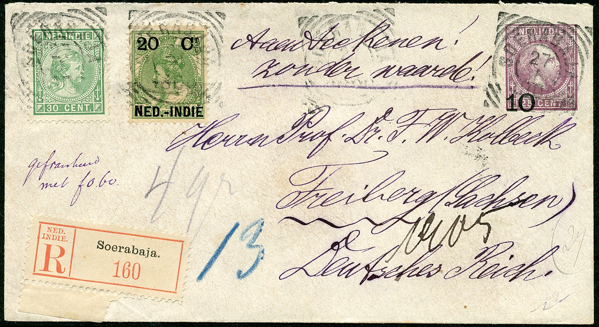 DUITSLAND. Env. G13a groen bijgefr. met 30c nr. 28 en 20c nr. 34 aangetekend van Soerabaja 27-7-1900 naar een hooggeleerde heer te Freiberg 29-8
