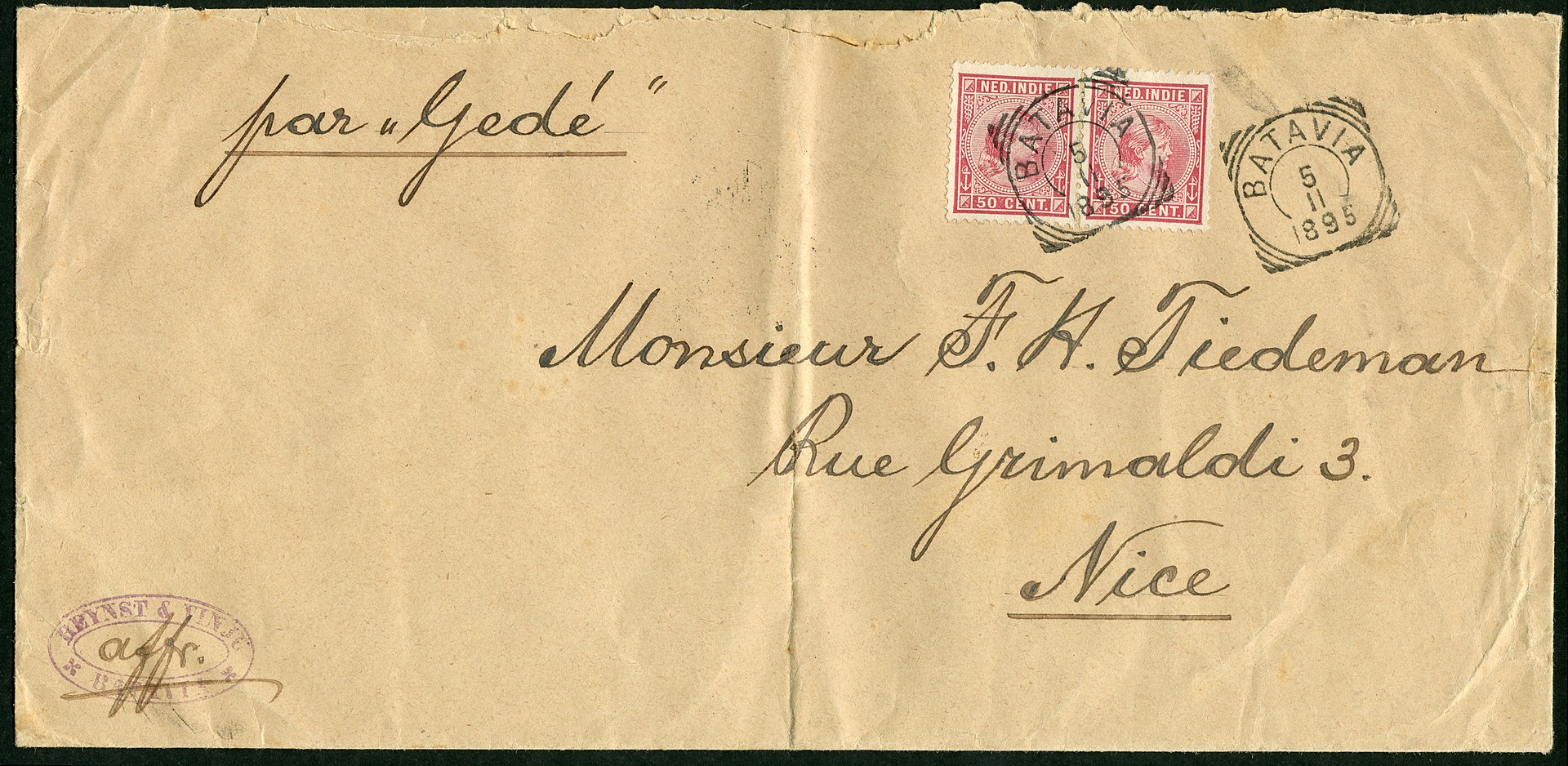 FRANKRIJK. 50 Cent nr. 29 in paar op langformaat envelop (vert. vouw) van de 4e gew. klasse (45-60 gr) van Batavia 5-11-1895 'par Gedé' (stoomschip van de Rott. Lloyd) naar Nice 2-12