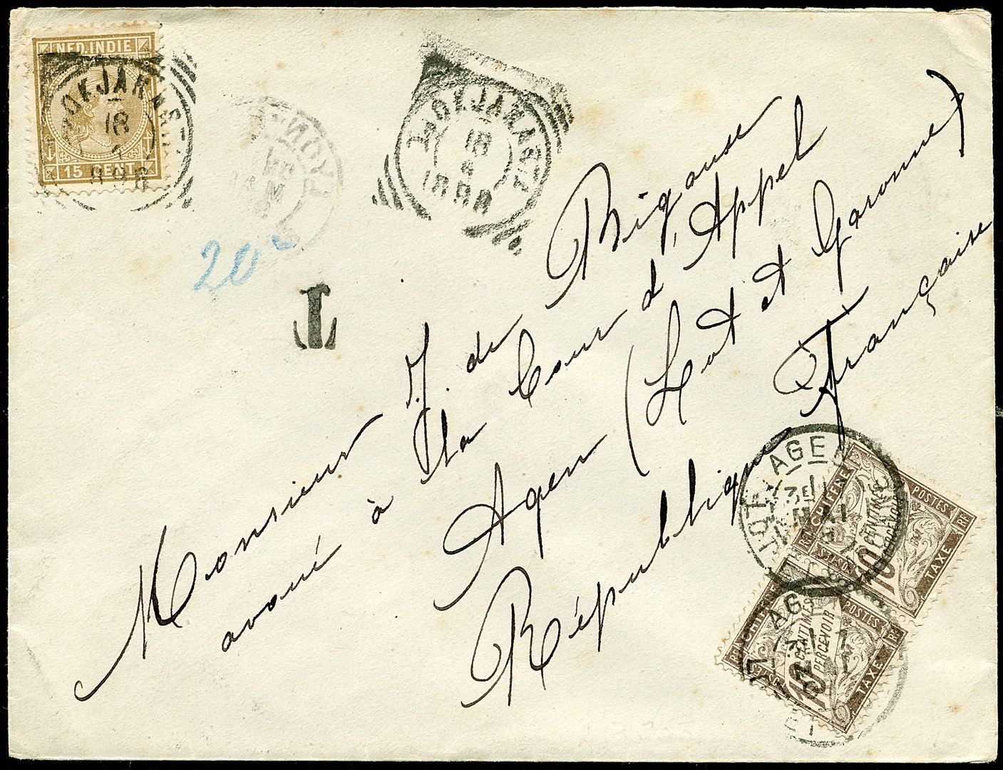 FRANKRIJK. 15 Cent nr. 25 op env. van Djokjakarta 18-4-1898 over Maos, Weltevreden en Lyon naar Agen Lot-et-Garonne en daar op 17-5 met 20c beport omdat het tarief vanuit Indië 25c i.p.v. 15c bedroeg