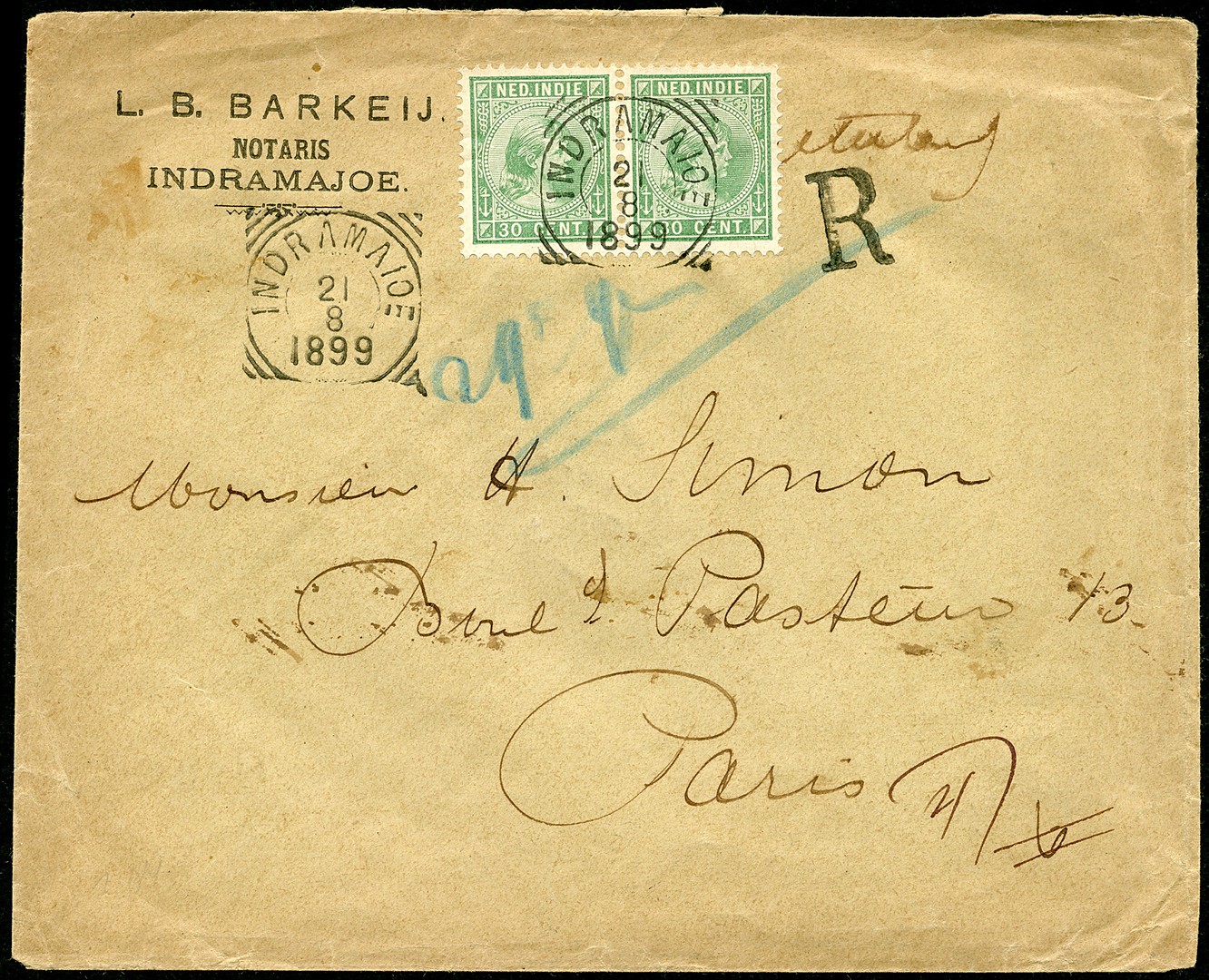 FRANKRIJK. 30 Cent nr. 28 in prachtpaar op couvert van notaris van 29 gram, aangetekend van Indramaioe 21-8-1899 over Cheribon en Weltevreden naar Parijs. Briefport 2e gew. klasse 50c + R-recht 10c. Zeldzame frankering!