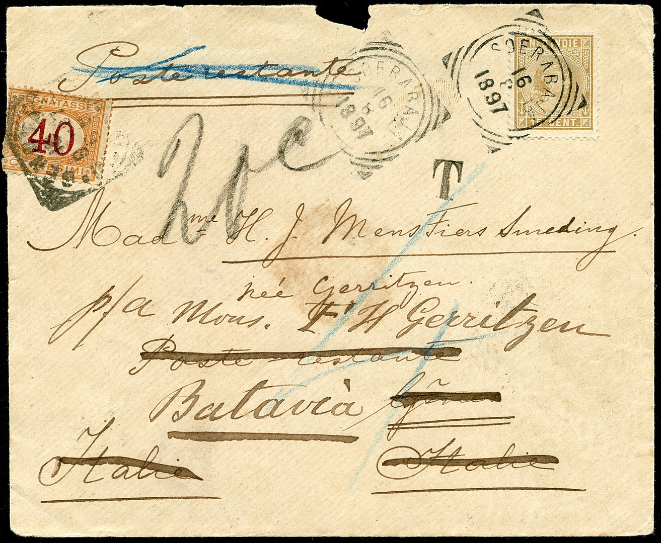 ITALIË. 15 Cent nr. 25 van Soerabaja 16-8-1897 over Weltevreden 17-8 naar Genua 16-9 en daar met 40c beport (portzegel defect) want tarief vanuit Indië bedroeg 25 cent, doch doorgez. naar Batavia over Weltevreden 26-10