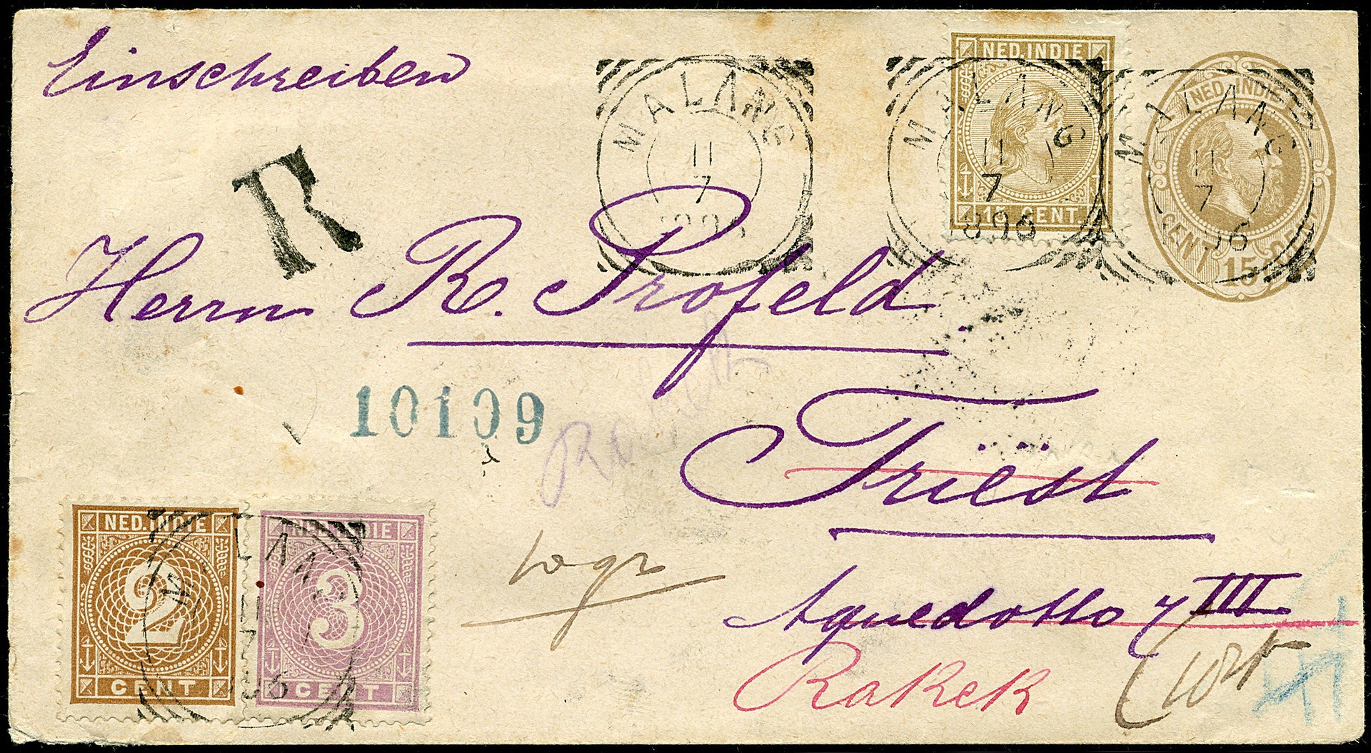 OOSTENRIJK-HONGARIJE. Env. G8 bijgefr. met 15c nr. 25, 2c nr. 18 en 3c nr. 20 aangetekend van Malang 11-7-1896 over Weltevreden naar Triëst 12-8, doorgez. naar Rakek 13-8 (nu in Slovenië)