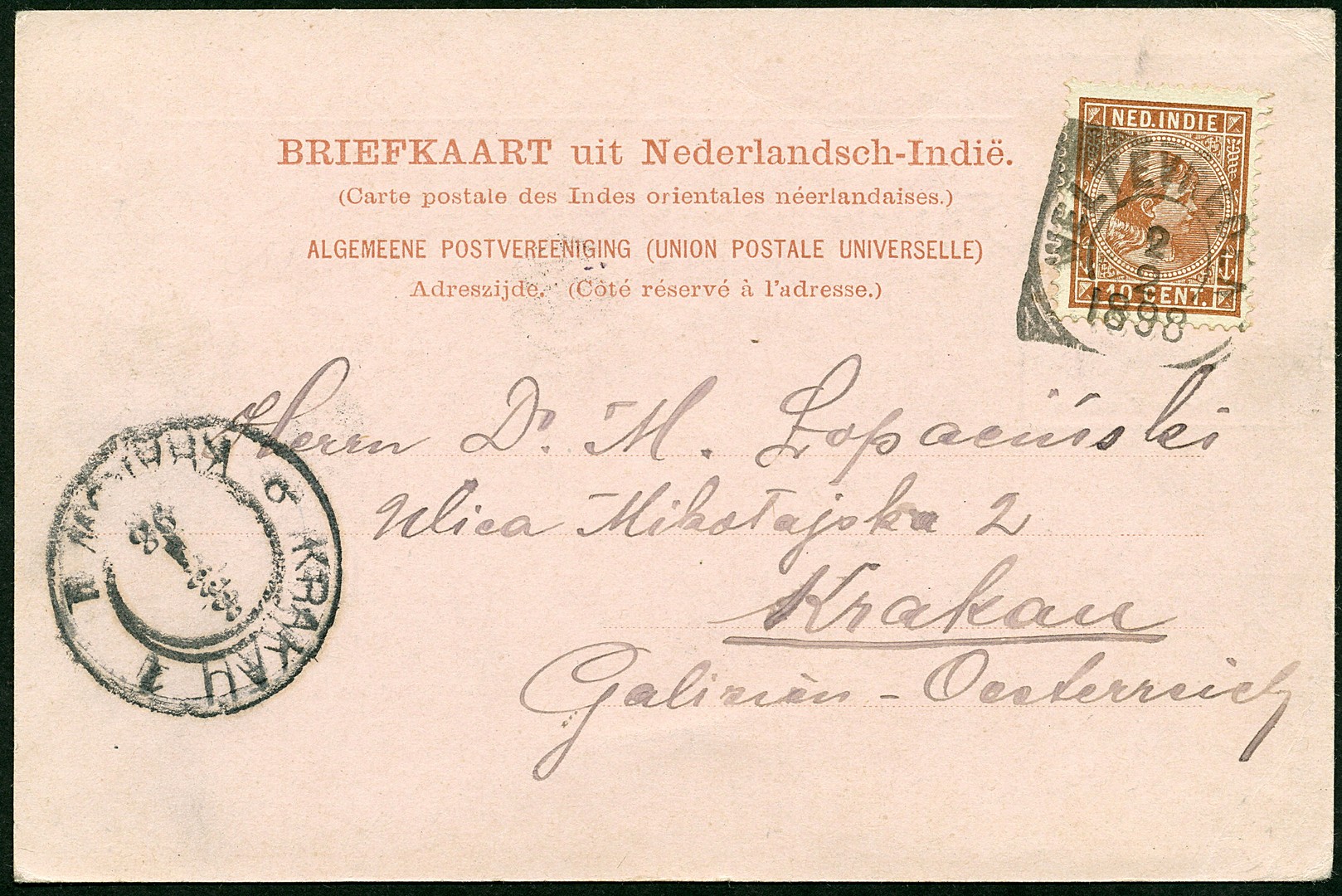OOSTENRIJK-HONGARIJE. Twee poststukken naar dezelfde geadresseerde in Krakau, toen in Galicië. 25 Cent nr. 27 (iets 'geoxideerd') op env. uit Benkoelen 12-4-1898 alsmede 10c nr. 23 op bk. uit Weltevreden 2-2-1898 met op schrijfzijde aardig portretje van 'H.M. de Koningin'