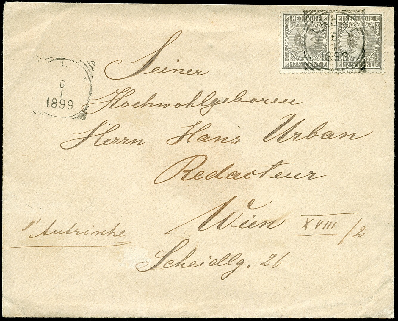 OOSTENRIJK-HONGARIJE. 12½ Cent nr. 24 in vrijwel prachtpaar op env. van Lahat 6-1-1899 via Palembang en de N.I.Agent Singapore 11-1 naar Wenen ?-2. Aantrekkelijk aspect!