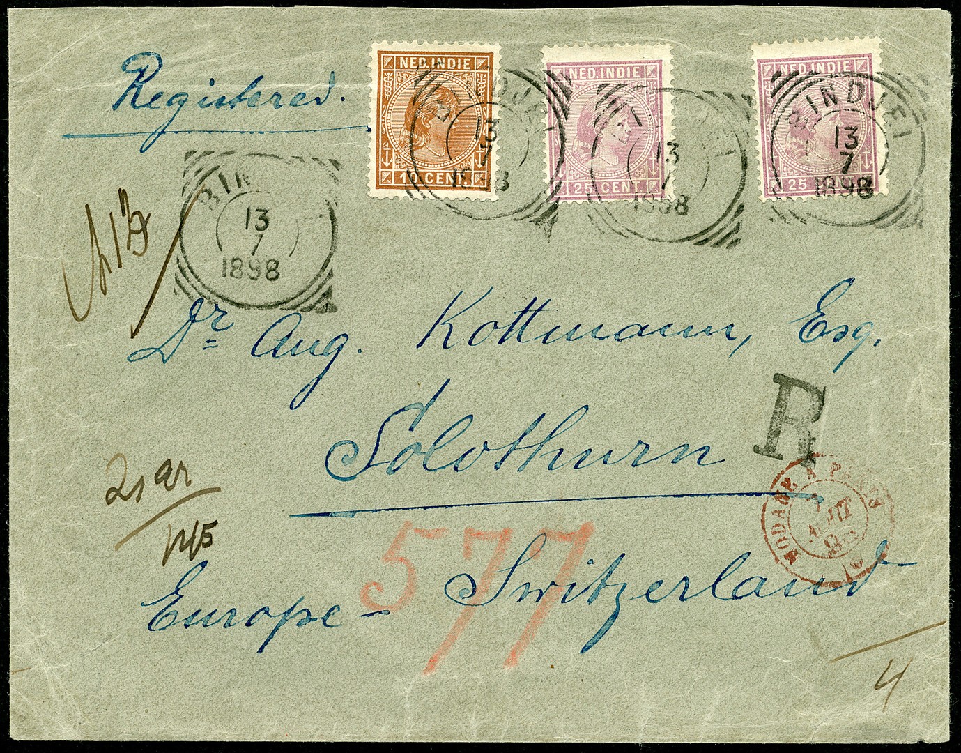 ZWITSERLAND. 10 Cent nr. 23 en 2x 25c nr. 27 op env. van 21 gram aangetekend van Bindjei 13-7-1898 over Medan en de N.I.Postagent Penang per traject Modane à Paris 7-8 naar Solothurn 8-8