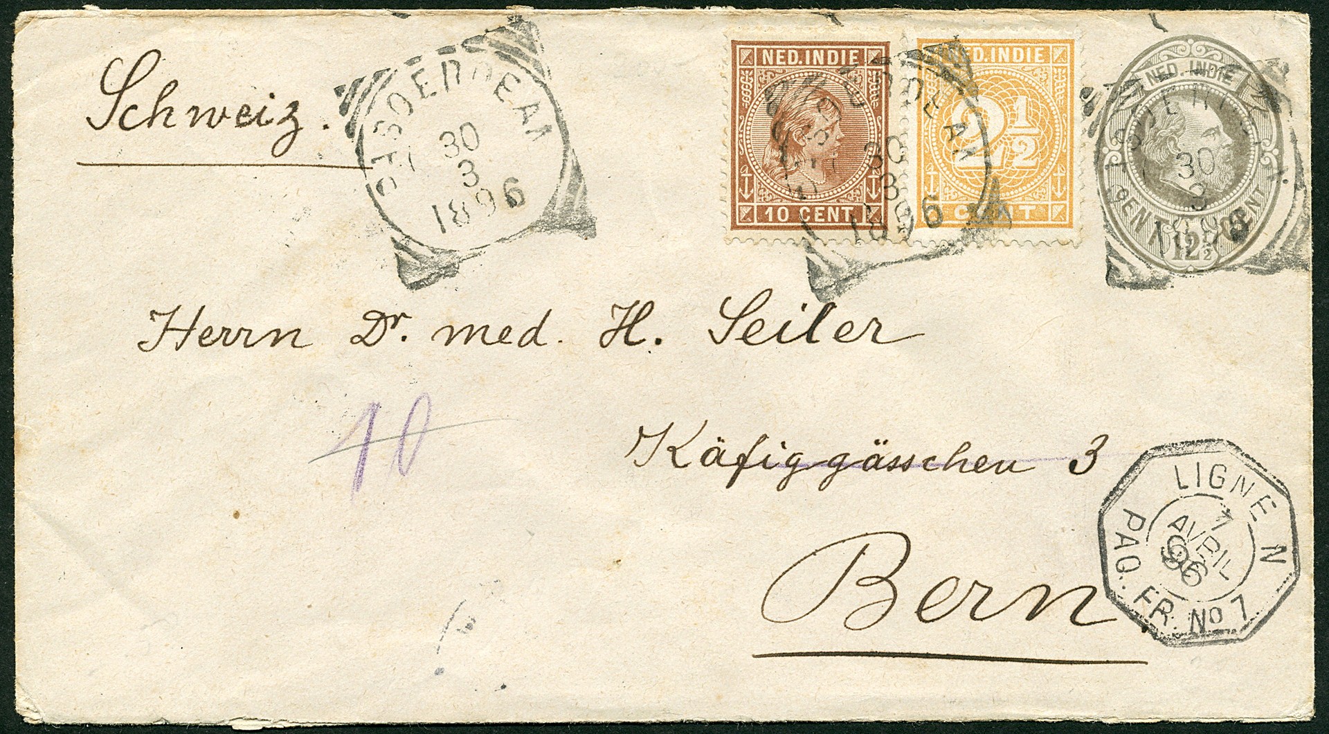 ZWITSERLAND. Vier enveloppen 1895-1900, aangetekend uit Batavia (1895) en Blora (1900), uit Pasoeroean o.a. met de Ligne N (1896) alsmede 25c enkelfrankering uit Medan (1896)