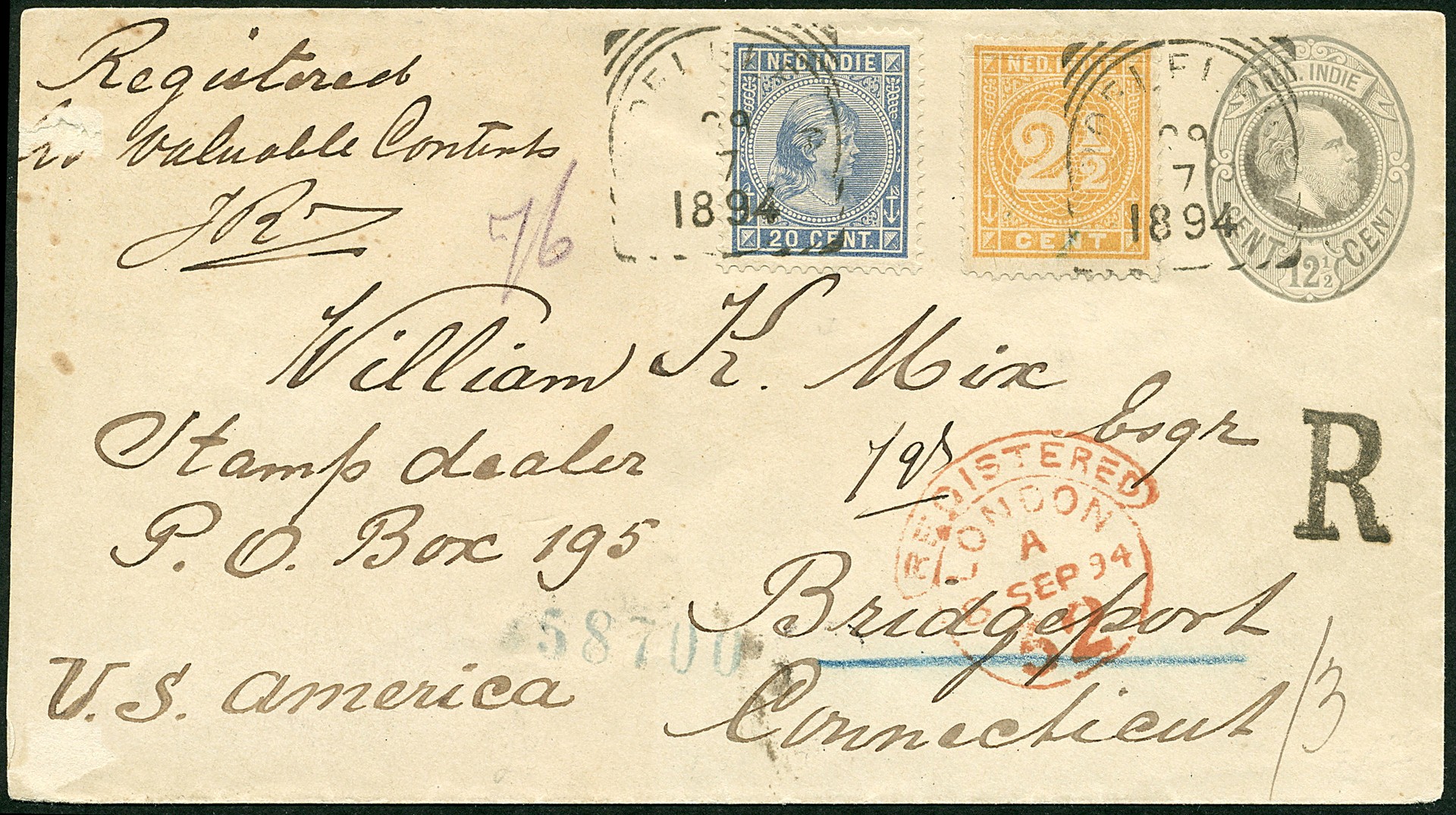 AMERIKA. USA. Env. G7 bijgefr. met 20c nr. 26 en 2½c nr. 19 (beide zegels zeer fraai) van Boeleleng 29-7-1894 (Bali) aangetekend over Soerabaja, Weltevreden over Londen 8-9 en New York 14-9 naar Bridgeport