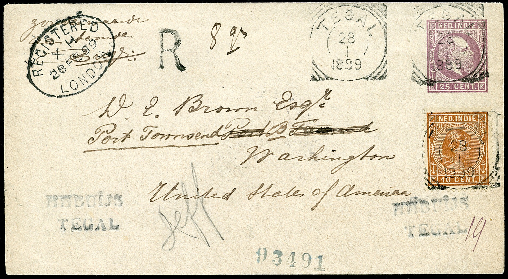 AMERIKA. USA. Env. G3c bijgefr. met 10c nr. 23 van Tegal 28-1-1899 aangetekend via Weltevreden, Londen 28-2 en New York 7-3 naar Port Townsend 14-3