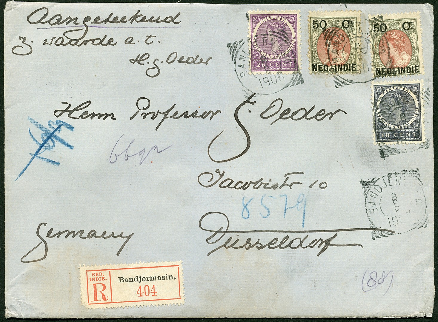 DUITSLAND. 50 Cent nr. 36, 10c nr. 48 en 25c nr. 55 op aangetekende env. van 66 gram van Bandjermasin 6-8-1906 naar een professor in Düsseldorf 18-9. Mooie en schaarse mengfrankering! Tevens R-env. met nrs. 31 in paar en 33 (1902) en env. G16 met nr. 31 uit Banda-Neira (1902)