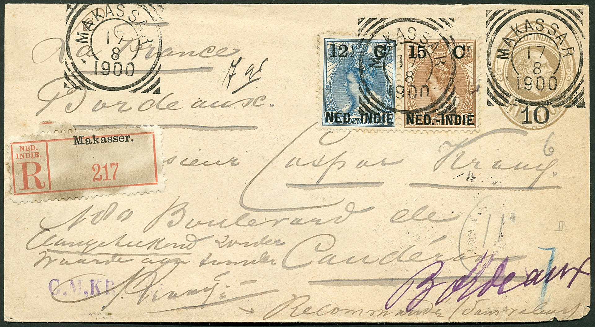 FRANKRIJK. Twee aangetekende env. uit Makassar (G11 met nrs. 32-33, 1900) en Probolinggo (nr. 31 en nr. 32 in prachtpaar, 1903)