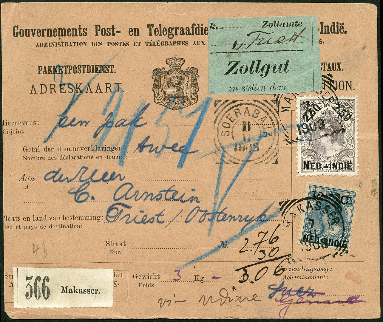 OOSTENRIJK-HONGARIJE. 2.50 Gulden nr. 37 met 12½c nr. 32 op adreskaart (lichte hor. vouw ook door zegel, doch nauwelijks zichtbaar) van Makasser 7-11-1903 via Soerabaja 11-11 naar Triëst 24-12. Zeldzaam document!