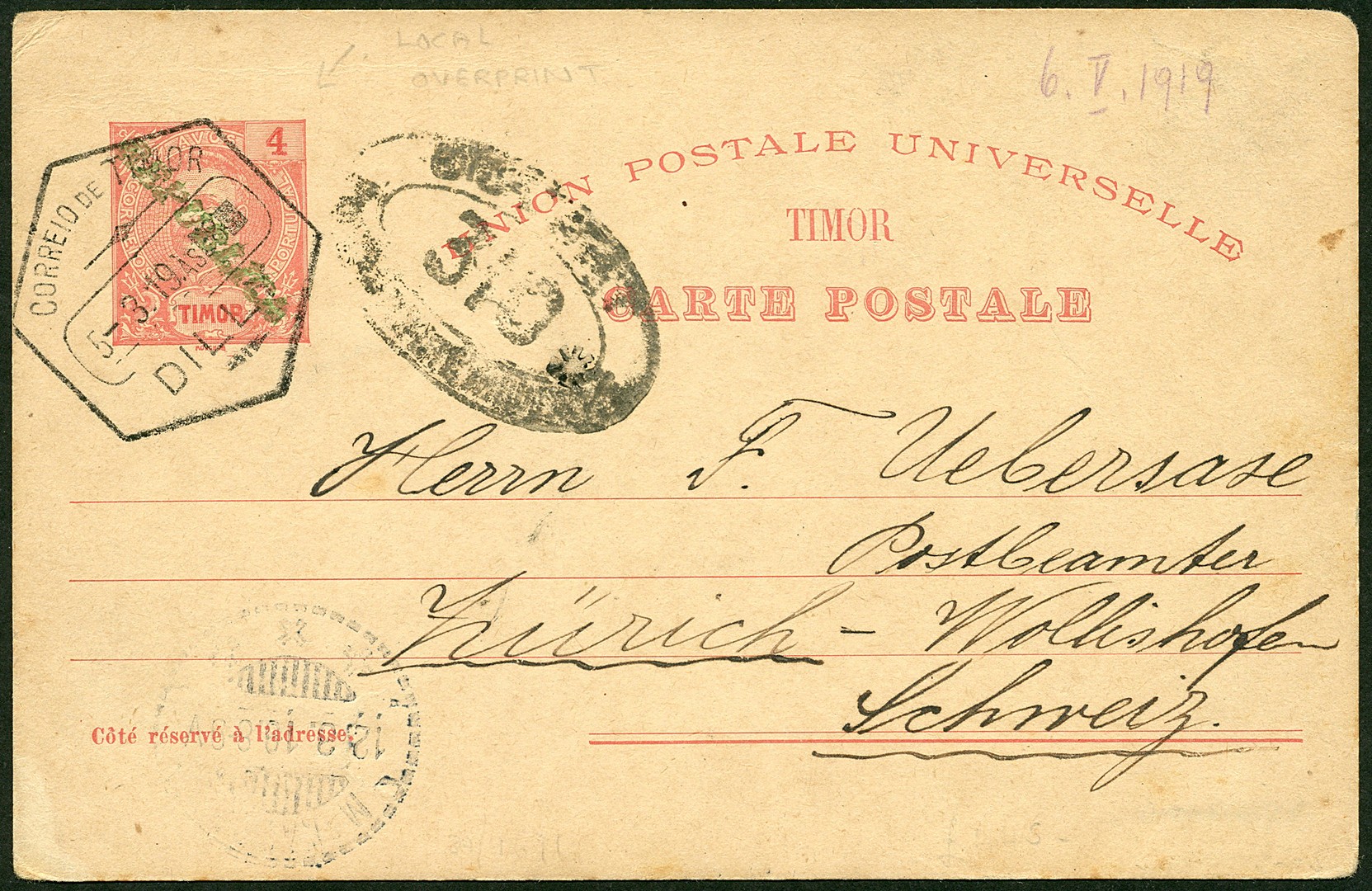 TIMOR VIA INDIË. ZWITSERLAND. Bk. van 4 avos met het bericht 'Bin auf der durchreise nach der Insel Alor', op 5-3-1919 via Makasser 12-3 naar Zürich en onderweg gecensureerd