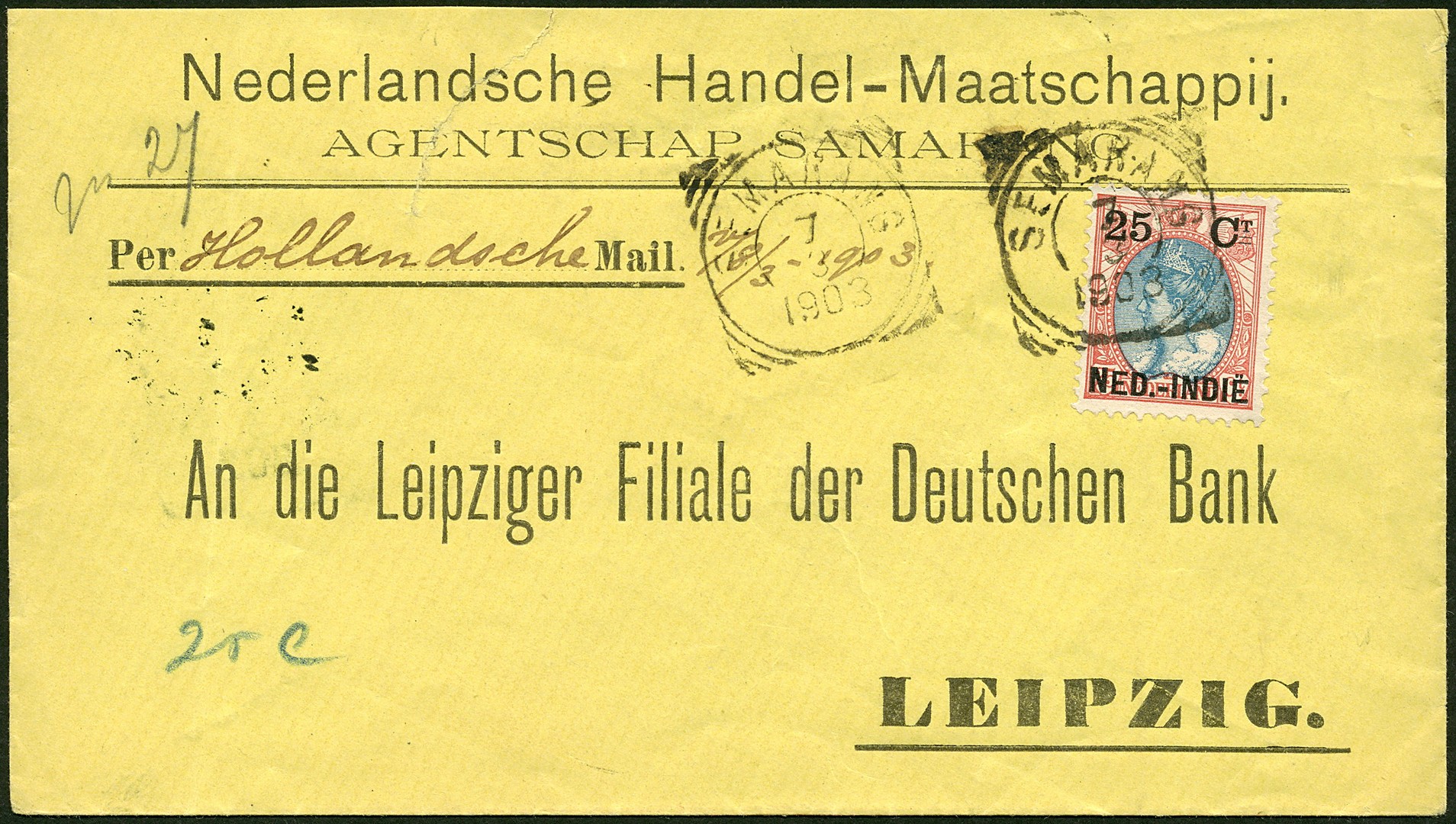 Zeer geel firmacouvert waarop 25c nr. 35 als enkelfrankering van Semarang 7-3-1903 naar Leipzig 9-4