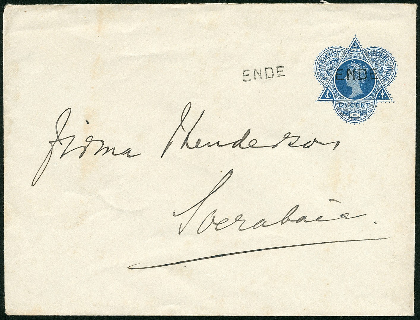 Env. G27 van Ende naar Soerabaja 5-2-1911 met 2x luxe afdruk naamstempel (SvL 300)
