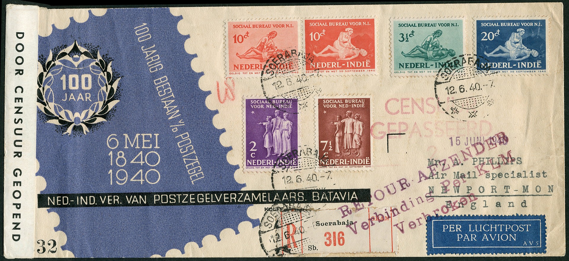 Verbroken Verbindingen. Speciaal couvert van de NIVvP (nr. 2832) versierd met de Sociaal-Bureauserie, aangetekend van Soerabaja 12-6-1940 met bestemming Engeland, gecensureerd, maar wegens verbroken verbinding per KLM retour 5-7-1940