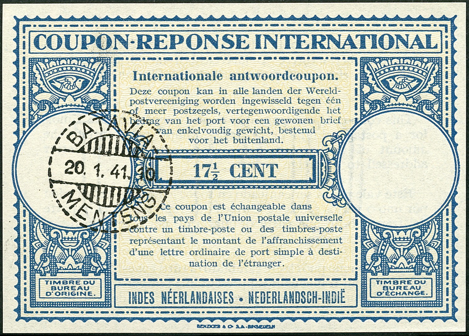 Internationale Antwoordcoupons. G1 (Soerabaja 29-1-1908), G2a (Paree 29-8-1933), G5 (Bandoeng 3-12-1937) en G7 (Semarang 4-11-1940 en Batavia- / Menteng 20-1-1941). Schaars