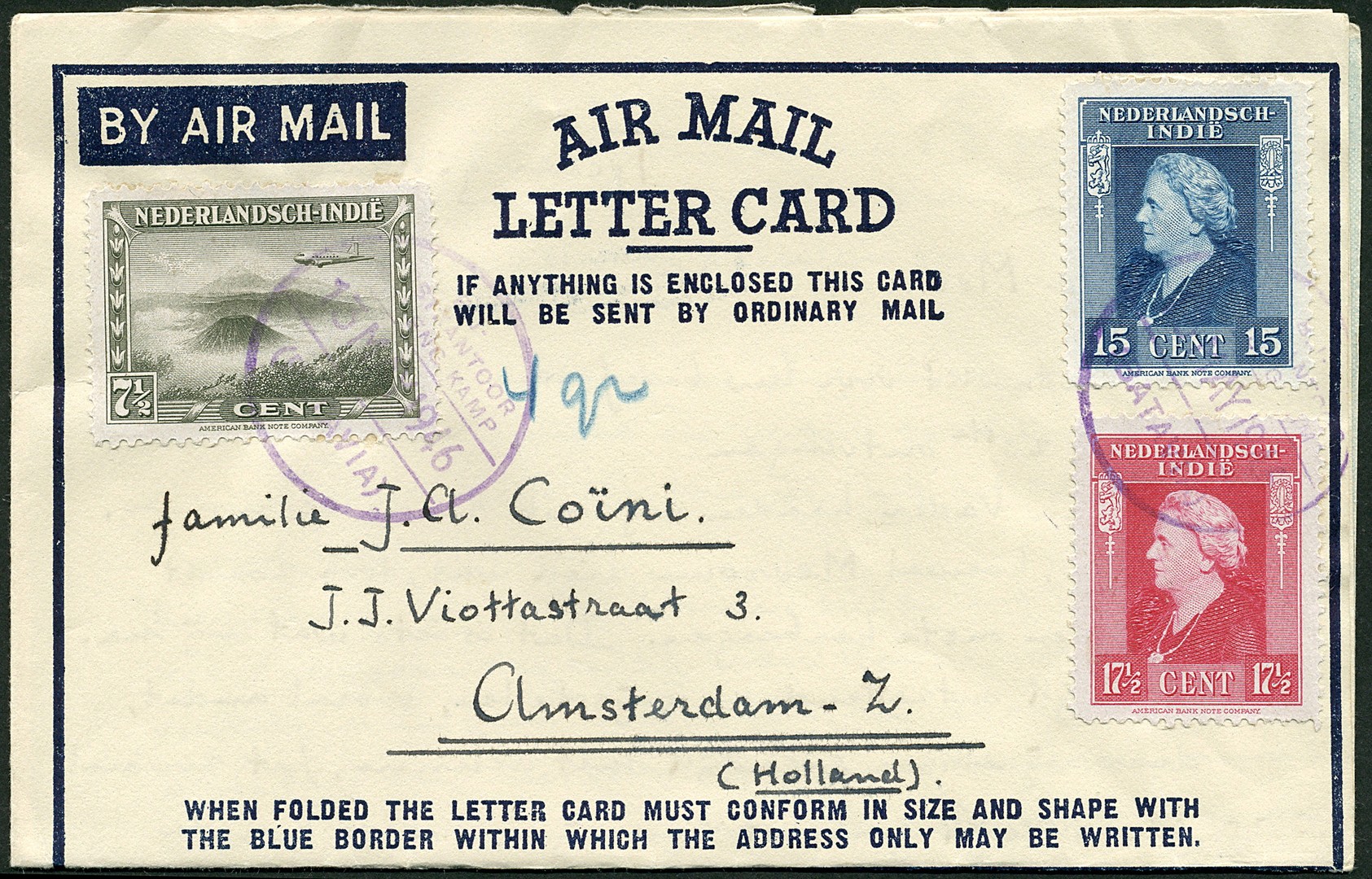 Air Mail Letter Card van 4 gram gefr. met 7½c, 15c en 17½c ABC-zegels van het Postkantoor Tjideng Kamp te Batavia op 13-5-1946 naar Amsterdam. Briefschrijvers zijn mensen die op repatriëring wachten
