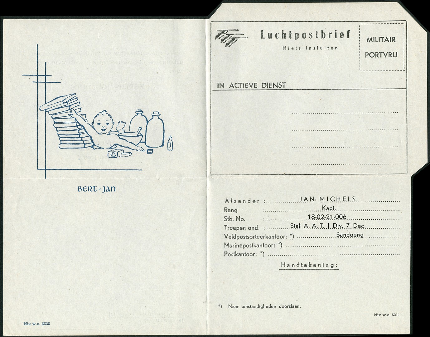 Militair luchtpostblad G7 waarvan de rechterhelft aan de binnen- en buitenkant in blauw is bijgedrukt (geboorteaankondiging), nu met drukmerk Nix w.o. 6535, en op de afzenderplaats in zwart door kapitein Jan Michels. Ongebruikte prachtkwaliteit, bedrukking door ons nog niet eerder gezien