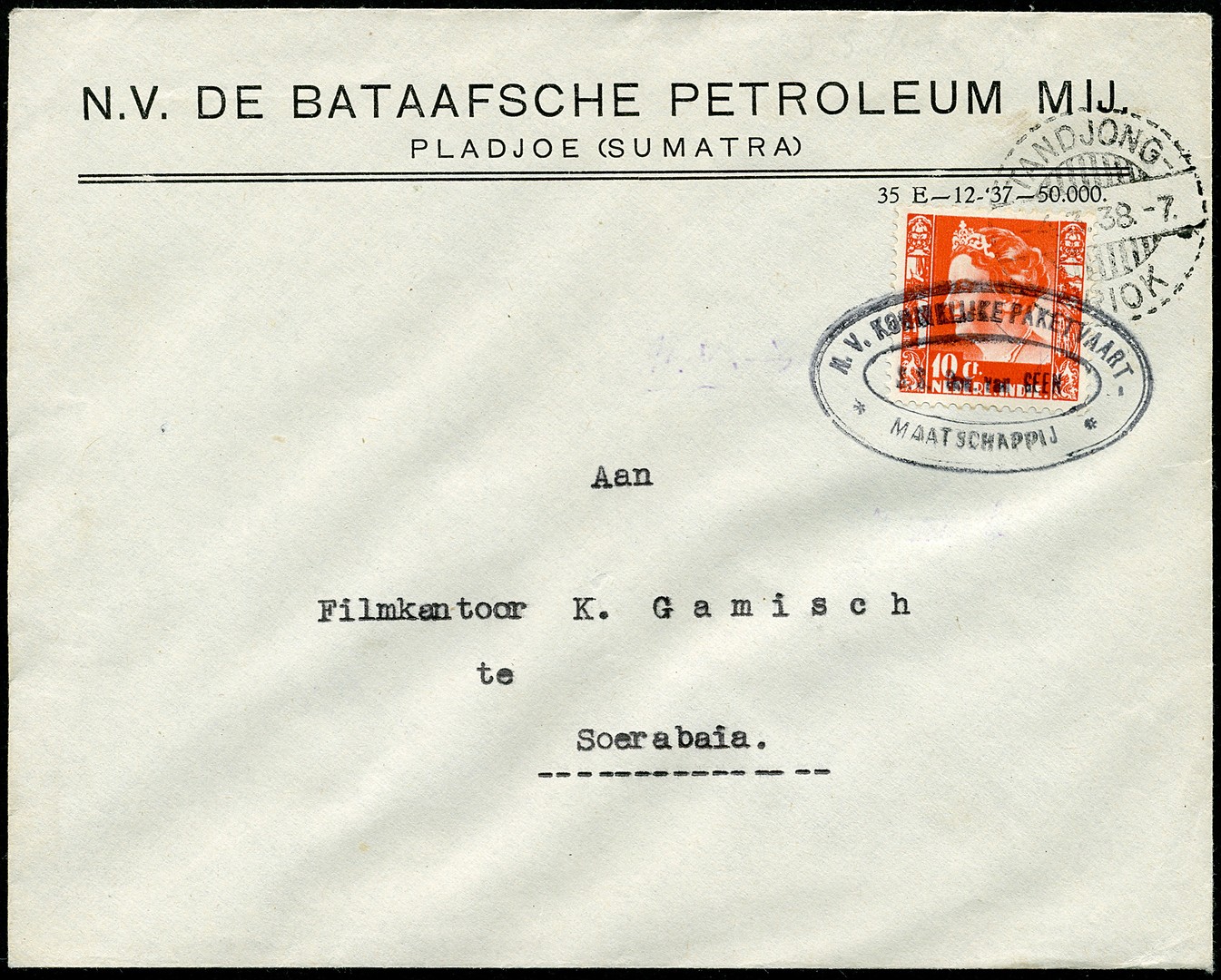 Env. van de BPM uit Pladjoe gefr. met 10c afgest. met KPM-ovaalstempel 'S.S. Gen. van GEEN' via Tandjong-/Priok 4-3-1938 naar Soerabaja 5-3