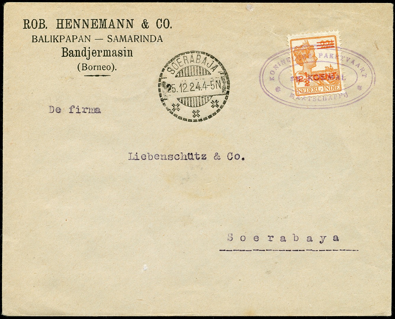 Firmacouvert uit Bandjermasin gefr. met 12½c mooi afgest. met KPM-ovaalstempel 's.s. KOEMAI.' naar Soerabaja 25-12-1924. Prachtafdruk van dit kleine vrachtschip van de KPM en zeldzaam! Ex Verkuil