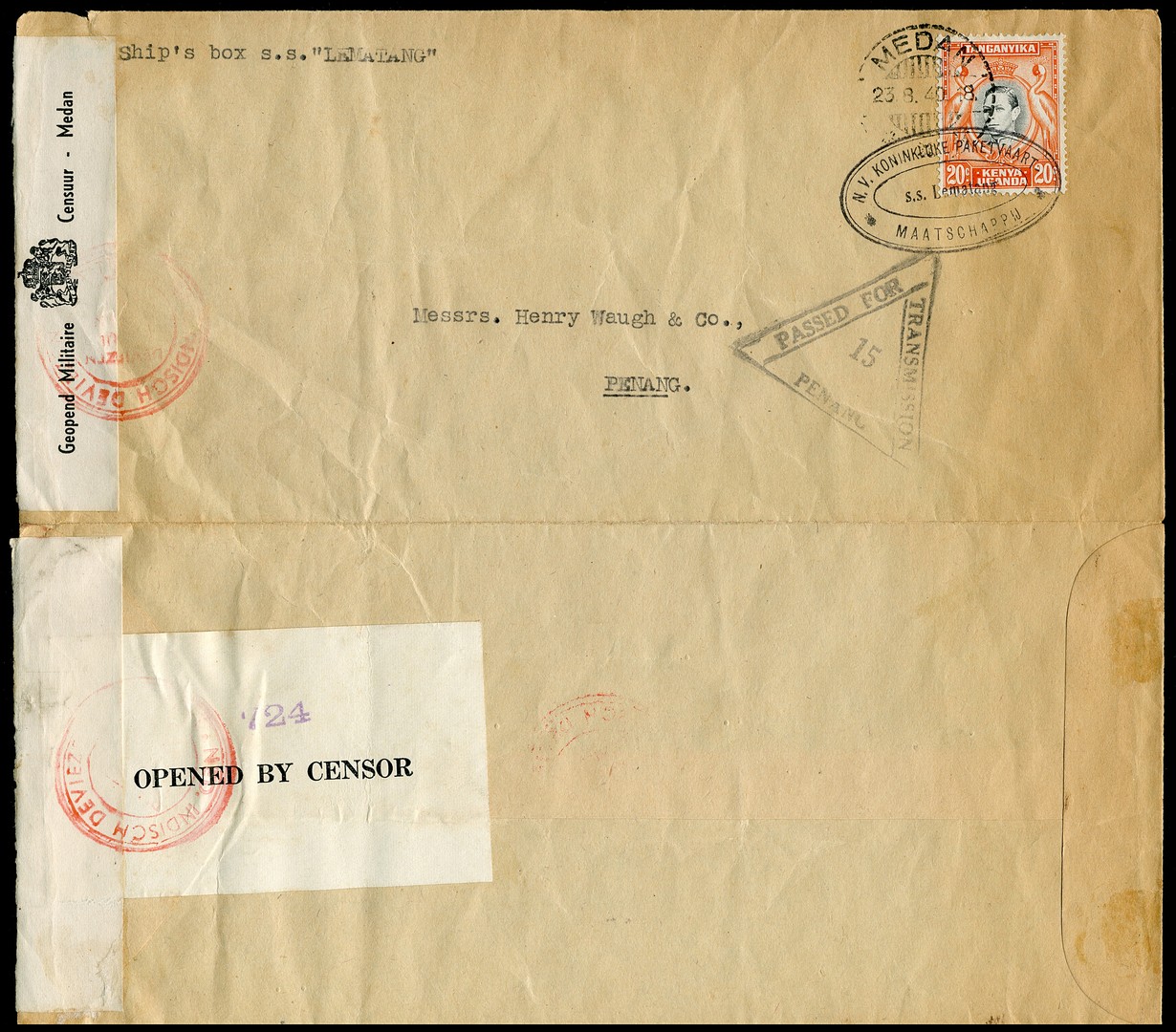 Langwerpig, aan 3 zijden geopend couvert gefr. met 20c K, U & T afgest. met KPM-ovaalstempel 's.s. Lematang' (type niet in Bu.) over Medan 25-8-1940 naar Penang. Militaire censuur Medan, deviezencensuur en Britse censuur