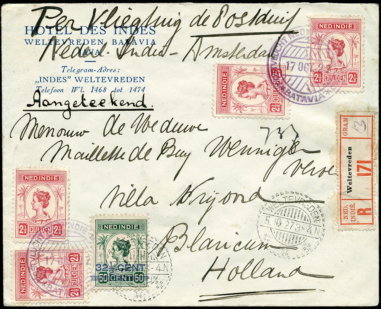 Koppenvlucht. Prachtcouvert van het meest fameuze hotel van Ned.- Indië, mooi gefr. en aangetekend naar een weduwe te Blaricum 29-10-1927. VH.B.15a