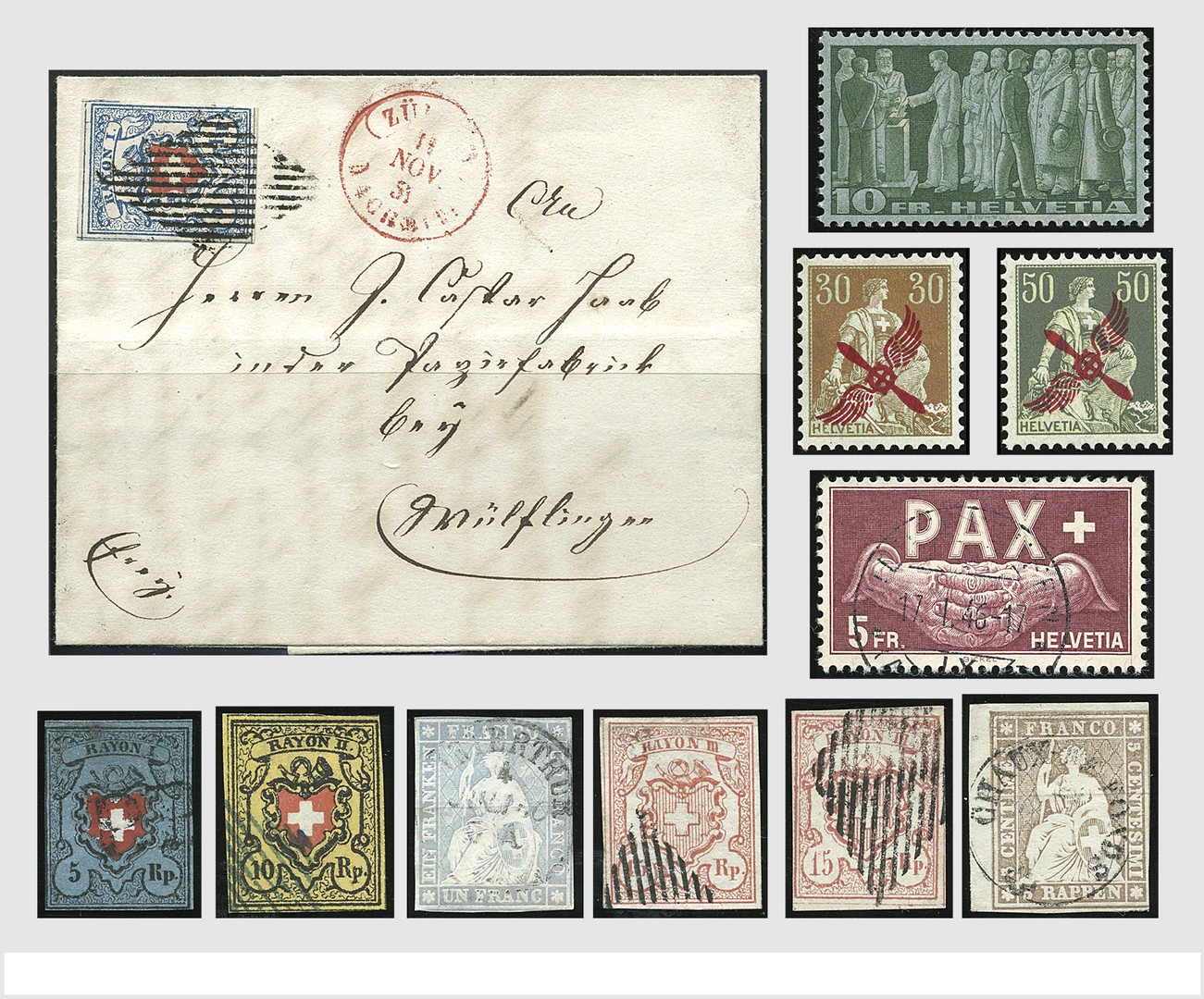 ZWITSERLAND 1850-2015 o/*/**, collectie wb. Mi. 6I(gerep.), 7II, 8II (3), 9II (2), 9II op brief, 10, 11, 12(2), aardige nrs. "Strubel", Zittende en Staande Helvetia wb. betere tandingen, verder aardig compl., gedeeltelijk zowel gebr. als ongebr. resp. postfris. Alle blokken, Luchtpost, wb. aardige brieven, Pax-serie gebruikt gekeurd/attest, combinaties, etc. Het klassieke deel is enigszins wisselvallig van kwaliteit, doch over het algemeen een keurige collectie met een enorme cataloguswaarde!