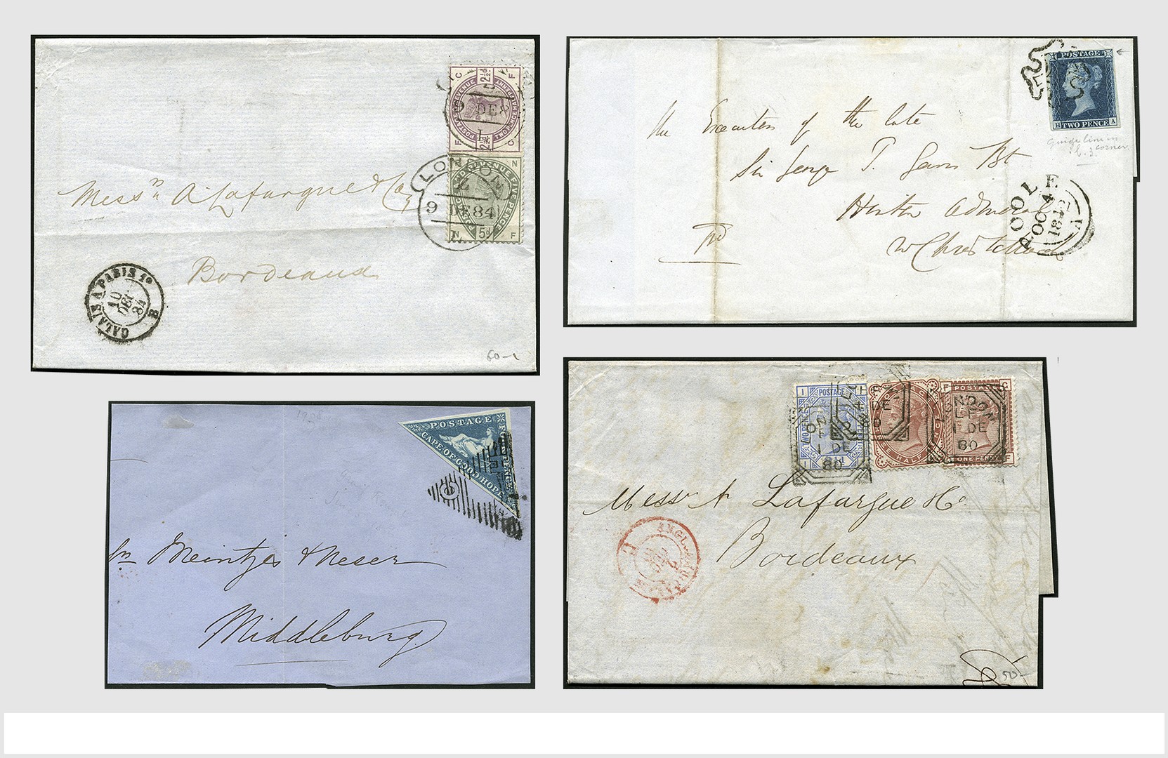 POSTHISTORIE, ENGELAND, partijtje oude brieven en kaarten met leuk materiaal. Tevens iets Koloniën waarbij 2 mooie gerande "Kaapse driehoeken" op briefstukje.