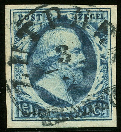 5 Cent diepdonkerblauw nr. 1a, plaat I pos. 77. Prachtex.