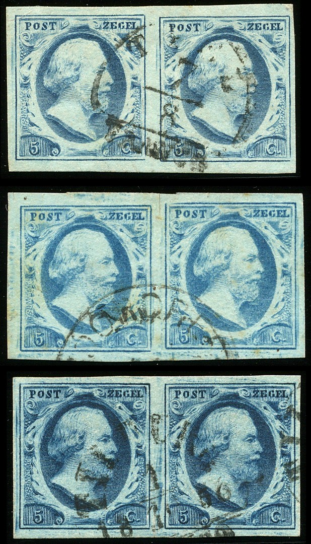 5 Cent blauw. 24 Losse zegels waarvan diverse randstukken en 4 paren, van verschillende platen waaronder gepositioneerd