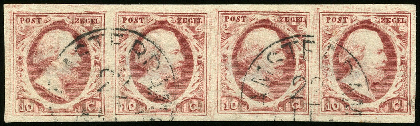 10 Cent rood nr. 2g, plaat IV pos. 96/99. Luxe strip van vier