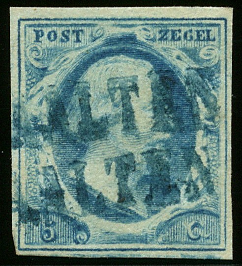 AALTEN in blauw (EY.R) op 5 cent blauw. Prachtex. met twee volledige afst. Zeldzaam!