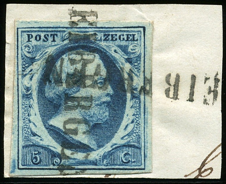 EIBERGEN (EY.250) op 5 cent donkerblauw nr. 1i, plaat III. Prachtex. op briefstukje waarop twee kruislings aangebrachte afst. Ex Klink en Van Dieten