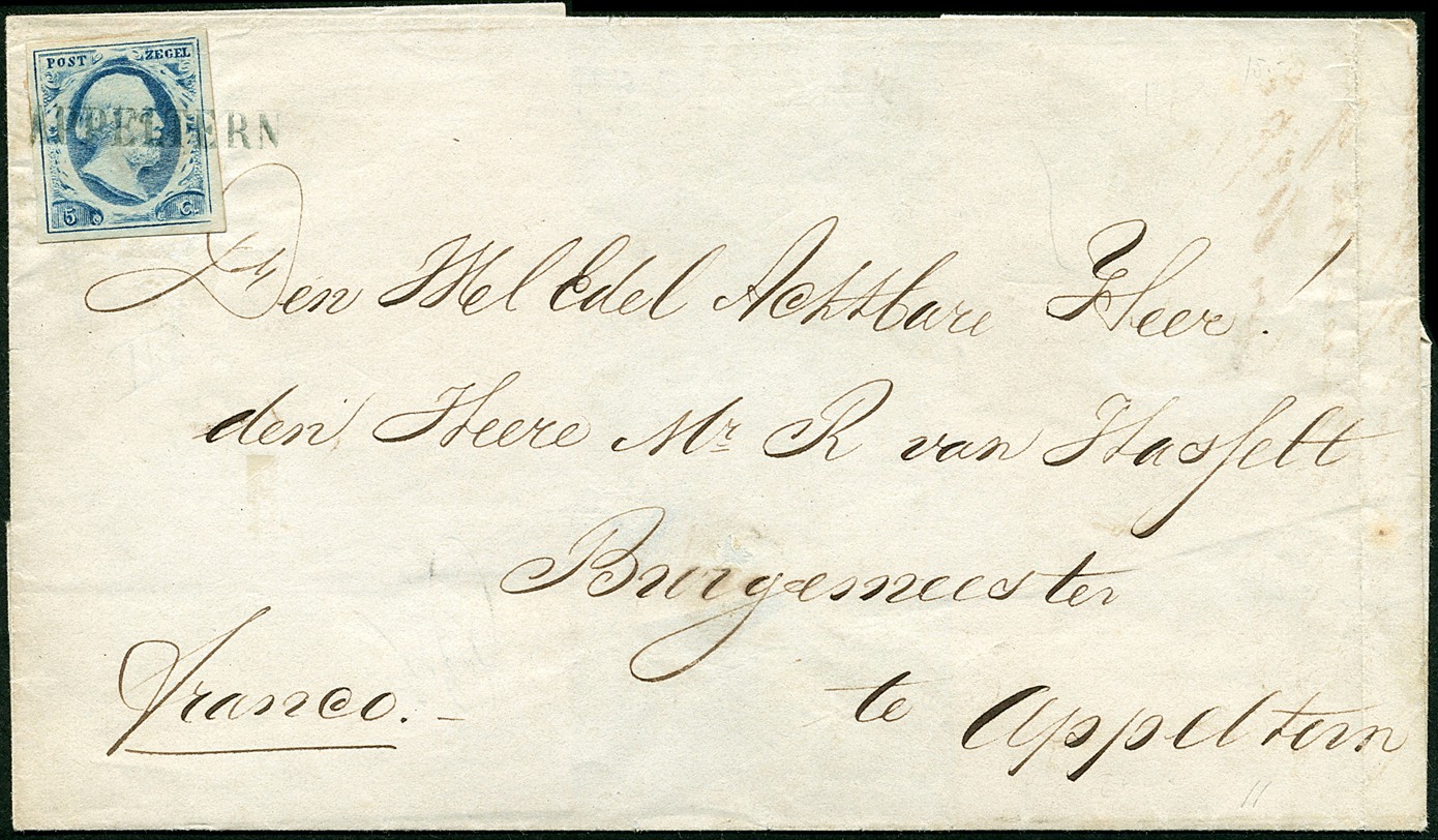 APPELTERN in blauw (EY.500) op 5 cent staalblauw nr. 1, plaat II pos. 17. Mooi gerande zegel op frisse, ongedateerde briefomslag naar de burgemeester van Appeltern. Uiterst zeldzaam op poststuk! Ex Klink en Van Dieten