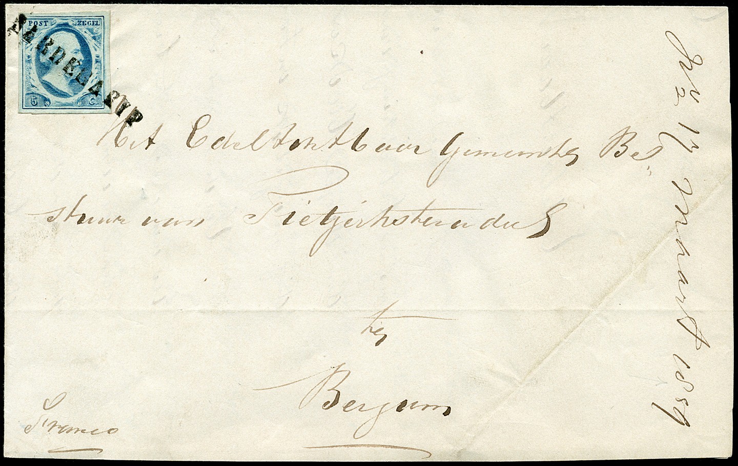 HARDEGARYP (EY.100) op 5 cent blauw nr. 1j, plaat III, pos. 44. Breed gerand prachtex. met ideale afst. op frisse, complete doch dichtgeplakte vouwbrief van 17-3-1859 naar het gemeentebestuur van Tietjerkstradeel te Bergum. Ex de Veer en Van Dieten