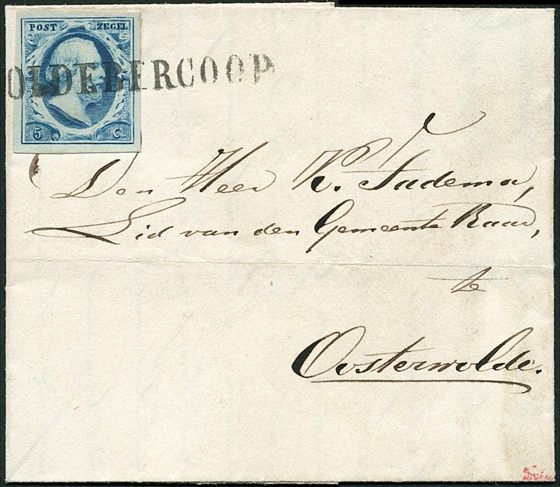 OLDEBERCOOP (EY.100) op 5 cent blauw nr. 1b, plaat I. Breed gerande prachtzegel met mooie afst. op zeer fris Convocatie-Biljet van de Burgemeester van Ooststellingwerf, op 14-8-1852 naar Oosterwolde