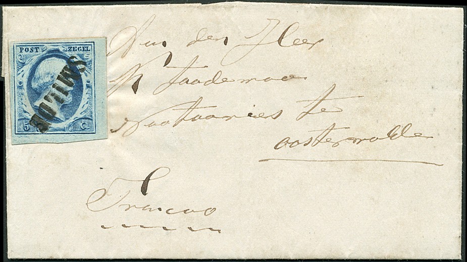 SMILDE (EY.100) op 5 cent donkerblauw nr. 1i, plaat III. Zeer breed gerande prachtzegel met volledige afst. op vrij frisse, complete vouwbrief van 20-12-1857 naar de notaris te Oosterwolde. Op az. eveneens een afdruk van het naamstempel. Ex Klink en Van Dieten