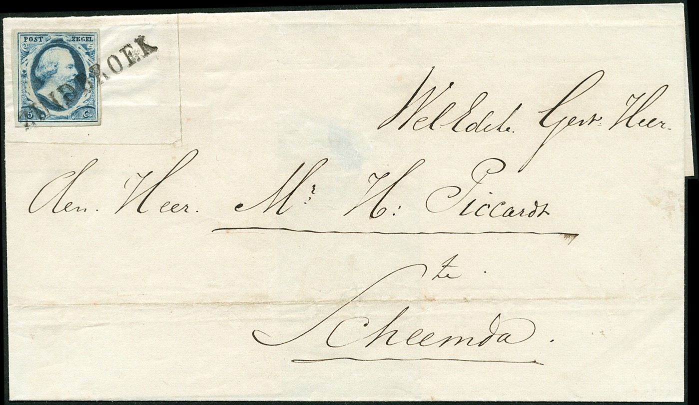 ZUIDBROEK (EY.R) op 5 cent donkerblauw. Prachtex. met mooie afst. uit ongedateerde briefomslag naar Scheemda geknipt, later weer teruggeplaatst. Ex Berghuijs