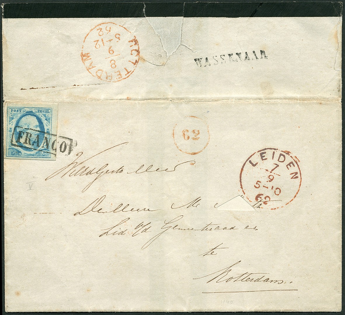 5 Cent staalblauw plaat I (prachtex.) afgest. Gouda A op briefomslag van 30-12(-1852) naar Rotterdam, 5 cent donkerblauw plaat III op lokale briefomslag van Amsterdam 1-7-1855, alsmede 5 cent lichtblauw plaat V op smoezelige rouwomslag van Wassenaar (az. naamstempel) over Leiden 7-9-1862 naar Rotterdam 8-9