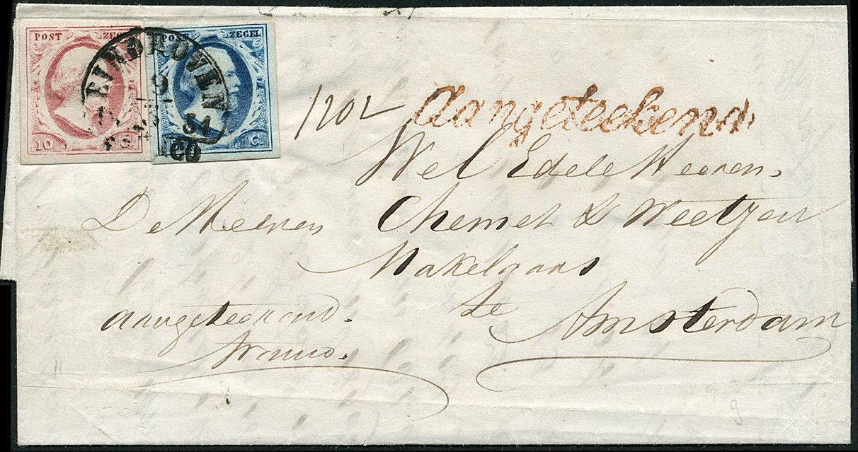 5 Cent donkerblauw plaar II pos. 38 (drie brede randen, boven rechts wat smal) en 10 cent karmijn plaat II pos. 10 (prachtex.) op wat verknipte vouwbrief (lakzegels weggeknipt) geschreven te Son op 9-3-1854, aangetekend te Eindhoven 9-3 (op az. geschreven R-recht '10') en verzonden naar de heren Chemet & Weetjen, makelaars te Amsterdam 10-3. Prachtige, rode afdruk 'Aangeteekend' in schrijfletters (PEP2,A140)