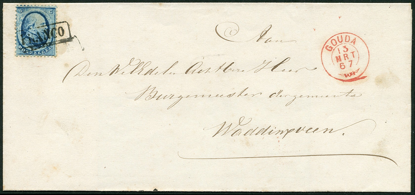 Burgemeesterspost. 5 Cent (prachtex.) op frisse briefomslag van Gouda 13-3-1867 (takjestempel in rood, tevens luxe afdruk op az.) naar Waddinxveen, alsmede 10 cent (prachtex.) op complete vouwbrief van Harderwyk 11-1-1865 naar Broek, een buurtschap bij Gouda 11-1