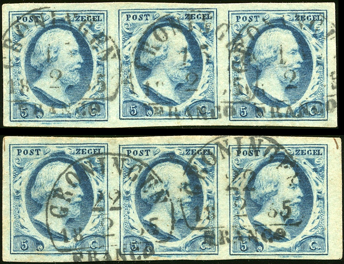 1d, 5 Cent plaat II in twee breed gerande prachtstrippen van drie, pos. 88/90 resp. 93/95. Oorspronkelijk hebben beide strippen aan elkaar vastgezeten, zo blijkt uit de vorm van de knip die de eenheid heeft gescheiden. De bovenste strip is afgest. Groningen B 15-2-1855, de onderste Groningen B 22-2-1855. De strippen zijn een week na elkaar gebruikt. Zeldzaam!!