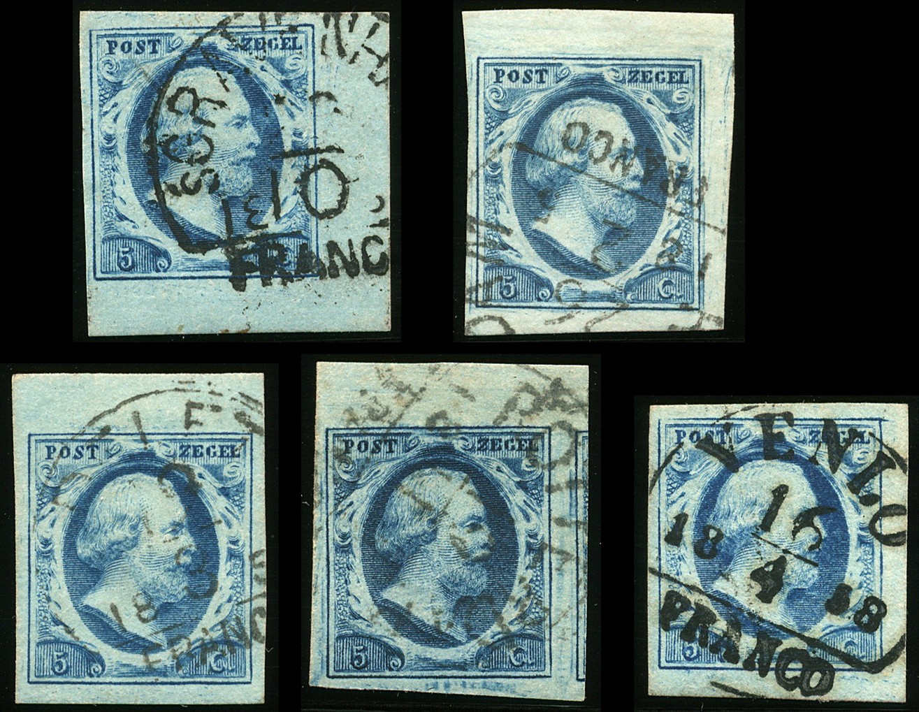 5 Cent plaat III. Op pos. 63 na een complete plaatreconstructie bestaande uit 96 losse zegels en 2 paren. De zegels zijn merendeels goed gerand waaronder rand- en hoekstukken, en van prima kwaliteit. De reconstructie laat de grote variatie aan blauwe kleurnuances, waarbij diep donkerblauw en zwartachtig blauw, van deze plaat goed zien