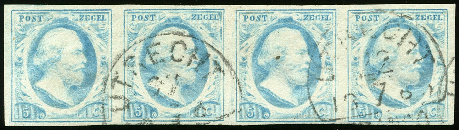 1n, Pl.IV-21/24. Strip van vier, licht te Utrecht afgestempeld. € 1700