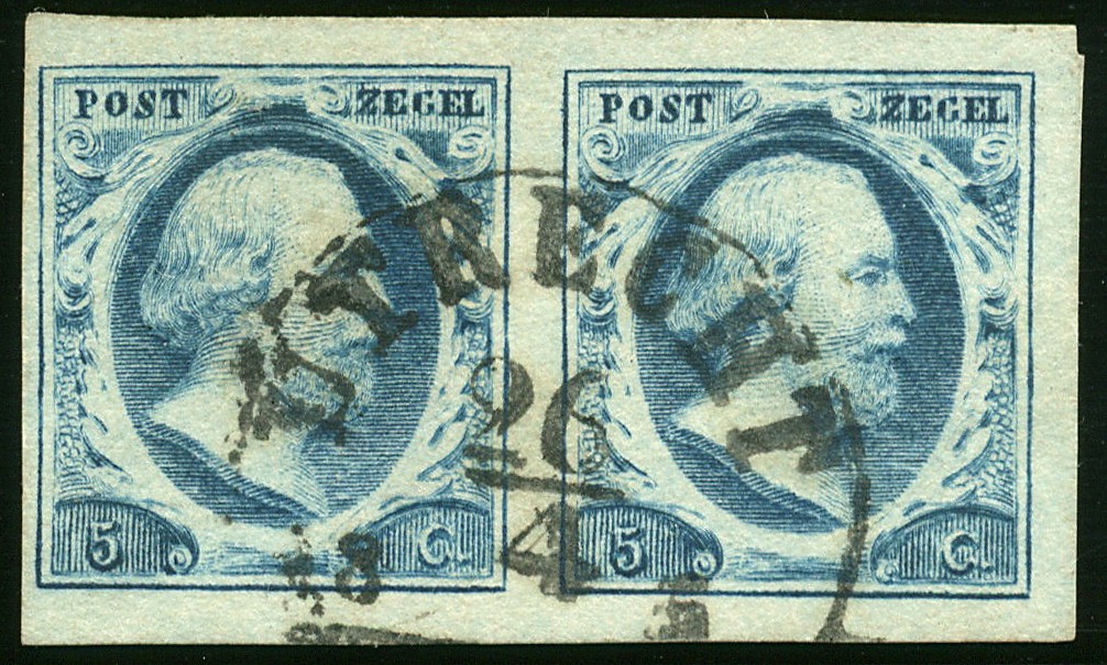 UTRECHT B (EY.50) op 5 cent nr. 1b-Pl.I-67/68. Aan drie zijden zeer breed gerand prachtpaar met vooral voor dit stempel een mooie afdruk waarvan jaarcijfer ontbreekt