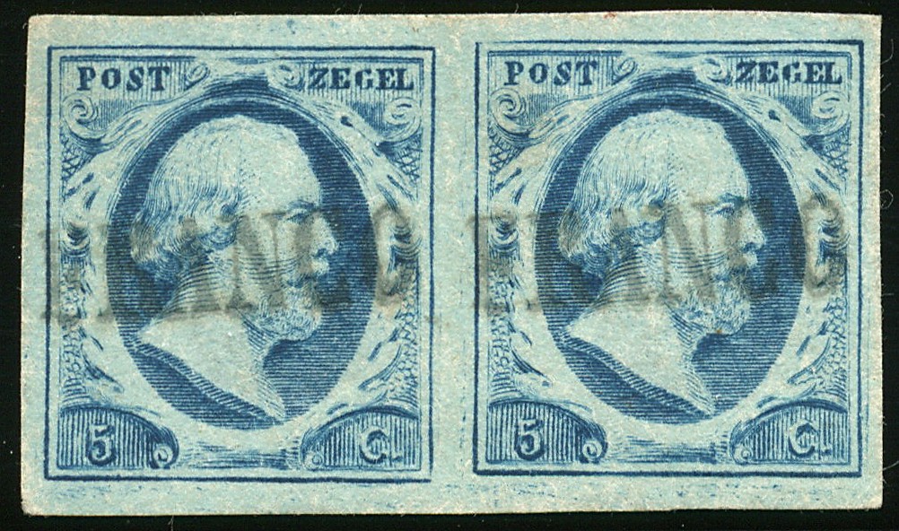 Franco zonder kader op 5 cent nr. 1j-Pl.III-13/14. Prachtpaar met een afst. op elke zegel