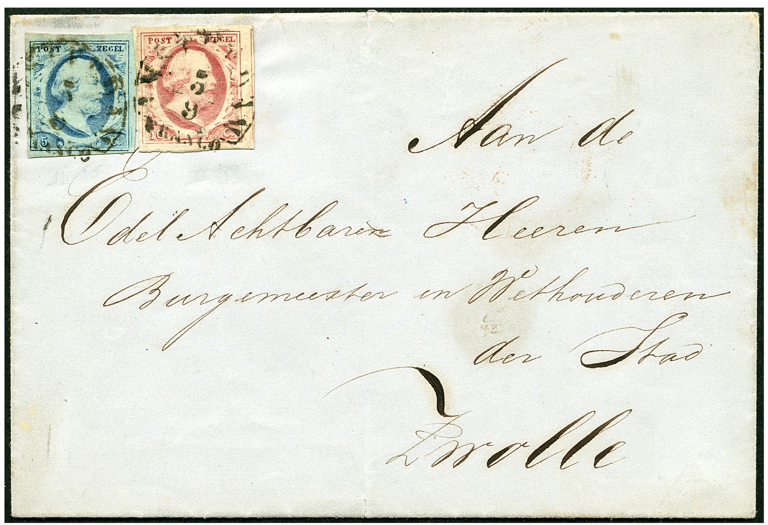 AMSTERDAM A groot (EY.50) op 5 cent grijsblauw nr. 1e-Pl.II-25 en 10 cent karmijn nr. 2d-Pl.II-88. Prachtex. resp. goed tot breed gerand ex. allebei volledig gest. op briefomslag van 5-9(-1854) naar het stadsbestuur te Zwolle 6-9-1854. Attest 'Vleeming, 2011´
