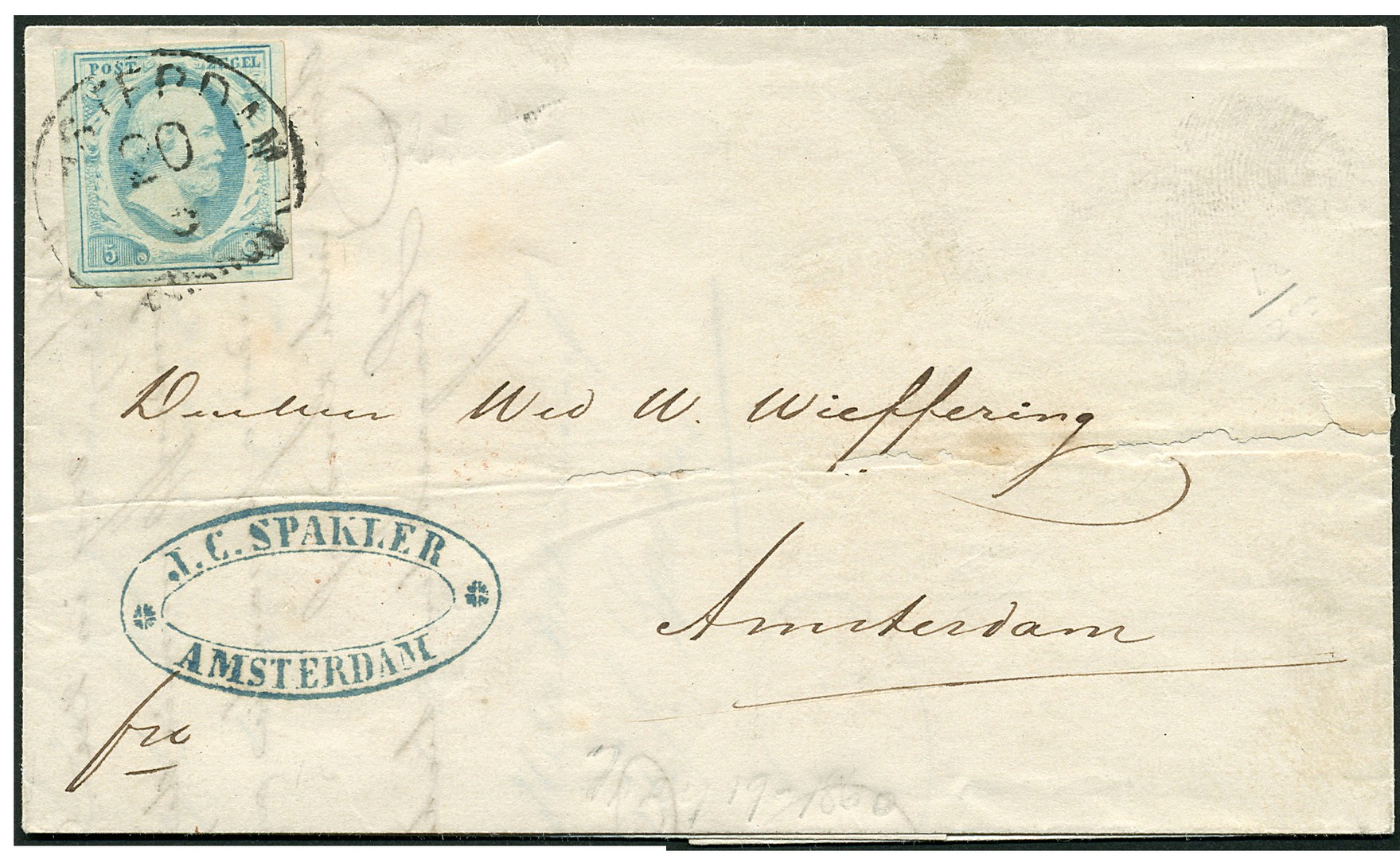 AMSTERDAM C zonder jaar (EY.125) op 5 cent nr. 1n-Pl.IV-16. Aan drie zijden breed gerand prachtex. met volledige afst. op iets beschadigde vouwbrief lokaal verz. op 20-5-1860, az. rondstempel en bestellersstempel 30 in cirkel